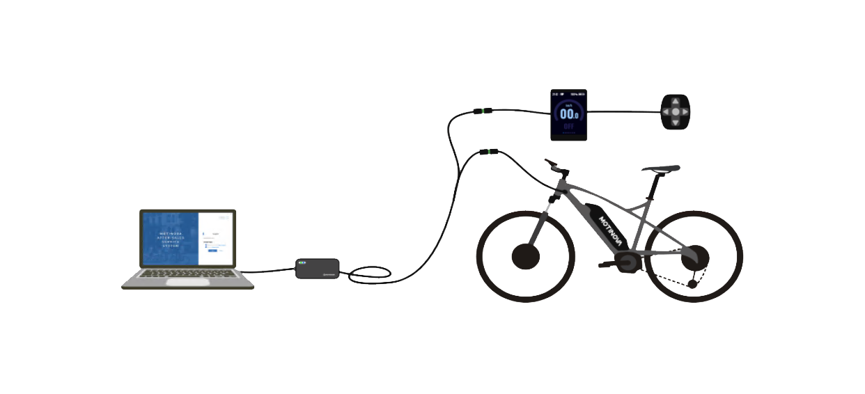 Sluit de E-Bike aan op de pc volgens het diagram (dit kan per type verschillen), zet de E-Bike aan, en klik vervolgens op ’link to bike’.